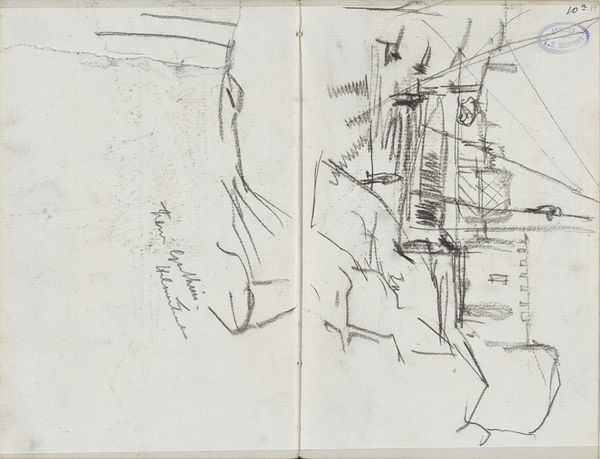 Curator: Here we have George Hendrik Breitner's "View of the Damrak in Amsterdam," an ink drawing created sometime between 1912 and 1919. Editor: It strikes me immediately as something very raw, very immediate. There’s a skeletal quality to the linework – a sense of things just barely held in place. Curator: Indeed. Breitner was very interested in capturing the fleeting, the ephemeral. You can see that in the loose, almost gestural quality of the lines. Note the structural framework. It's all about the essence of form and perspective. Editor: But even within those quick strokes, I see an older, almost mythical Amsterdam peeking through. That single spire, almost swallowed by the blank space on the right page—it echoes the city’s long maritime history, and that slightly unnerving quiet it might hold when everyone has left for the evening. Curator: The use of negative space here is very deliberate. The contrast between the heavily worked left page, with it's concentration of dense markings, and the comparatively blank right page pushes the structure even further toward the fore. We find that by exploring emptiness, space also takes on a tangible form. Editor: Absolutely. The emptiness highlights a longing, a searching feeling, but what for? Perhaps Breitner, consciously or not, was pointing to what’s been lost over time? Curator: Perhaps, or maybe he’s trying to isolate the core visual experience: pure form. The subject—Amsterdam—is merely a vehicle for his study of lines and space, for creating and conveying a sensation through visual means. Editor: Ultimately, the beauty for me lies in that ambiguity. It allows viewers to connect with their own interpretations and remember shared stories embedded in Amsterdam. Curator: Yes, the artwork does invite a degree of interpretive openness even as it maintains a formalist logic. Editor: So while Breitner offers only these stark lines, viewers have to engage to conjure that rich image in their own mind. It truly bridges the subjective with objective in a captivating dance of historical vision.