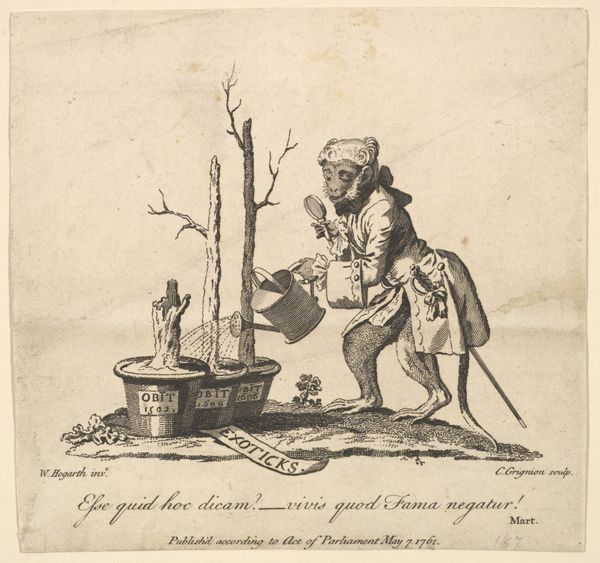 Curator: This print is called *Muziekleraar*, or *The Music Teacher*. It comes to us from between 1733 and 1792 and is the work of Jean Baptiste Guélard. Editor: It's a bit strange, isn't it? The figures have a dreamlike quality. Almost like something out of a fable, all rendered in this fine, detailed engraving style. What catches your eye first? Curator: Well, undeniably it is the curious, anthropomorphic scene, with a feline figure seemingly instructing two seated cats. Editor: Right! The material of printmaking lends itself perfectly to satire like this. The ability to reproduce and disseminate these images would have offered a wider commentary on class, taste, and cultural norms of the time. Imagine the conversations this would have sparked. Curator: I see the violin slung over his back. This instructor clearly identifies with the revered image of the musician, his social status affirmed through recognizable garb. Perhaps it’s poking fun at the era's obsession with appearances. Editor: And the way he's holding the baton – like an extension of himself. It’s interesting that the artist is able to bring our attention to the gestures and posture, despite the strange combination of human and animal anatomy. Look at the clothing: what material would that be, who produced that, and who consumes this image? Curator: Exactly, what traditions and behaviours are being mocked or supported? Fables using animals, even in ancient cultures, often carried lessons in how to act, but also how NOT to act. Here, the clothing and baton may be symbols of elevated status, ripe for ironic representation. Editor: These materials place the scene in a tangible context. And don't overlook the skill needed for engraving in the Baroque style—the technical labor alone speaks volumes about craft, not just in artmaking, but also class distinctions implied in its subjects and consumption of the print. Curator: Agreed. Thinking of lasting symbolic significance through form—it presents a thought-provoking lens through which to understand the art world and our evolving understanding of society. Editor: It's fascinating to consider the convergence of labour, materials, class critique, and animal metaphor that is packed into this unassuming print!
