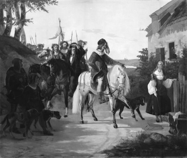 Editor: This is "Biskop Rembert frikøber kristne fanger af hedninger" by Peter Raadsig, made sometime between 1821 and 1837. It looks so dramatic in black and white – all those figures frozen in a tense scene. What strikes you about the composition? Curator: Notice how Raadsig organizes the figures. There’s a clear division: the Bishop, the captives, and the monks form a cluster bathed in a lighter tonality, drawing our gaze immediately. To the left, a darker mass of captors creates a visual counterweight. What effect does this use of contrasting light and dark have? Editor: It really does guide your eye. It almost feels staged, you know? The Bishop becomes the focal point against the ominous group on the other side. Is there any significance to this staged visual composition? Curator: Precisely. The artist utilizes this light-dark contrast to heighten the moral conflict. Observe, too, the postures. The captives are bowed, submissive, while the Bishop’s gesture is one of blessing, of liberation. Semiotically, it establishes a power dynamic. What of the landscape behind these figures? Editor: It recedes quite a bit, almost like a backdrop. Are the historical and narrative aspects relevant at all, or should we simply think of them as design elements, like light and shadow? Curator: The subject contributes to the piece, yet my principal interpretation of the work rests with the arrangement of form and color, here replaced by values of gray. We can appreciate its formal dynamism independently of the narrative it purports to illustrate. Notice that even the tree in the background acts as a framing device, accentuating the drama. It gives the painting a balanced asymmetrical harmony. Editor: It’s like the whole composition builds up to this apex. Thank you – I learned a lot about appreciating structure over story today. Curator: Indeed, it is by isolating visual components that the language of art is truly unveiled.