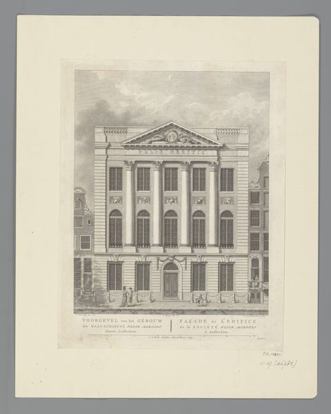 Curator: Before us, we have an etching from 1786, "Gezicht op het Maagdenhuis te Amsterdam," currently held at the Rijksmuseum. The piece is attributed to an anonymous artist. What are your initial impressions? Editor: It feels almost... clinical? All clean lines and right angles. Makes you think of architectural drawings rather than art meant to stir something inside you. There's something serene but also strangely detached about it. Curator: Indeed. The precision is paramount here. Observe how the artist employs line to define the building’s structure. The composition relies heavily on symmetry, emphasizing order and rationality, hallmarks of the Neoclassical movement it's connected to. Note also the text underneath, almost like a caption adding another layer to its intended formal use. Editor: You’re right, the symmetry is almost oppressive, isn't it? Even the clouds seem neatly arranged above the building, trying to mirror it, a true demonstration of trying to subdue even the organic, to the desire for rational composition! But you almost miss that the piece is about an orphanage, “Roomsche Weeshuis,” as it says. You would think there was so much life brimming there but the work makes it feel rigid, closed. Is there any relationship with the golden age? Curator: Its connection with the Dutch Golden Age resides more subtly, in the continuation of meticulous detailing and cityscape traditions but within a new, intellectually driven aesthetic. Notice, for instance, the meticulous representation, but without the emotive, painterly touch typical of earlier cityscapes. Editor: I suppose. So it’s a turning point... the death of one aesthetic and the cold birth of another. Even on paper you can almost hear a change in its pace and sense of space. Well, thanks to our little analysis I perceive it now as an elegy, both grand and deeply impersonal. Curator: An insightful synthesis, blending structure with sentiment, offering a wider view that this architectural artwork invites us to view with contemplation and insight.