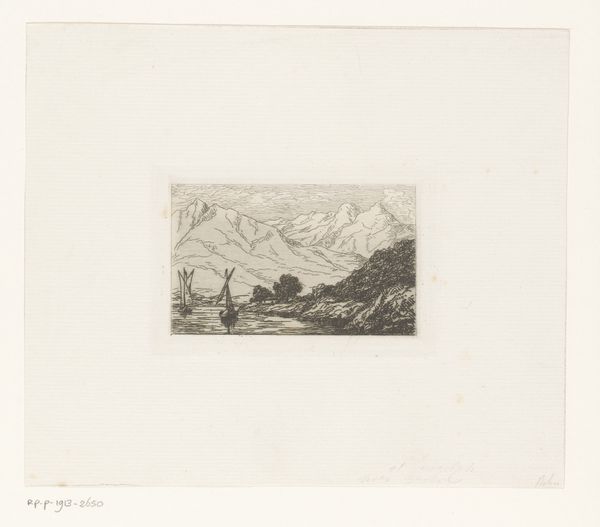 Adrianus Johannes Bik created this drawing, Javaans heuvellandschap, with pen in gray in the 19th century. A viewer’s initial experience of this drawing might be one of balance and tranquility. Soft grey tonalities create a harmonious composition in which the landscape's elements are carefully arranged. The composition employs a clear foreground, middle ground, and background, creating depth and inviting the eye to explore the scene. The mountains in the background fade into the distance, rendered with lighter tones, suggesting atmospheric perspective. The precise linework defines the forms of the vegetation and the small building, imbuing the landscape with detail. The semiotic function of this landscape drawing shifts our understanding of nature as something to be investigated, classified, and, in many ways, owned. Consider how this drawing encapsulates a moment in time, but also reflects broader cultural attitudes towards the natural world. It’s a reminder that how we represent the world around us is never neutral. We can continue to question and explore our relationship with the environment.