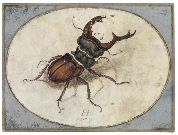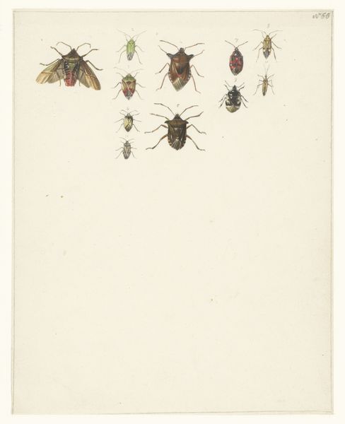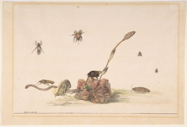 Curator: What immediately strikes me is the contrast between the delicacy of the drawing and the somewhat grotesque detail of the insects. Editor: I find myself drawn to this piece—believed to be from between 1600 and 1700 and presented courtesy of the Metropolitan Museum of Art—titled “A Bumble Bee and a Fulgoroid”. The use of coloured pencil creates a wonderfully tangible feel, don't you think? How do you see the piece in the context of its period? Curator: Certainly, we see echoes of the scientific illustrations that were becoming increasingly popular during that period, especially with the rise of natural history. Yet, these insects, divorced from any naturalistic background, take on an almost symbolic weight. I think of the representation of power structures through seemingly innocuous imagery; how do seemingly 'objective' observations reflect existing power dynamics? Editor: I agree there's something deeper at play than mere documentation. The fact that we don't know the artist's identity speaks volumes about the period's art world, especially how those without established reputations could be excluded from the narratives that get written into history. These small studies would rarely enter the grand narratives around that era's history. The art market reinforces existing social and political stratifications to this day. Curator: Exactly. The artist gives attention to the textures and individual segments of the creatures' bodies, transforming something as seemingly unimportant as an insect into a thing of scientific interest. Considering gender studies, this piece invites consideration: Were women engaged in scientific and artistic fields but not formally credited for their work? It may very well be that an individual that could not fully take ownership of its name created the work. Editor: That makes me look closer at the bumble bee in the lower section, you can clearly see its hairy body and protruding tongue—the detail is amazing, considering. The unknown individual certainly demonstrated great artistic skill. It would have been fantastic if more information regarding this work could be accessed! Curator: For me, what's most fascinating is how such seemingly neutral art possesses layers of cultural encoding regarding naturalism, scientific discovery, and the socio-political and gender-biased backdrop to its creation. Editor: Thank you; viewing this from a broader, historically critical viewpoint sheds light on this humble work in exciting new directions.