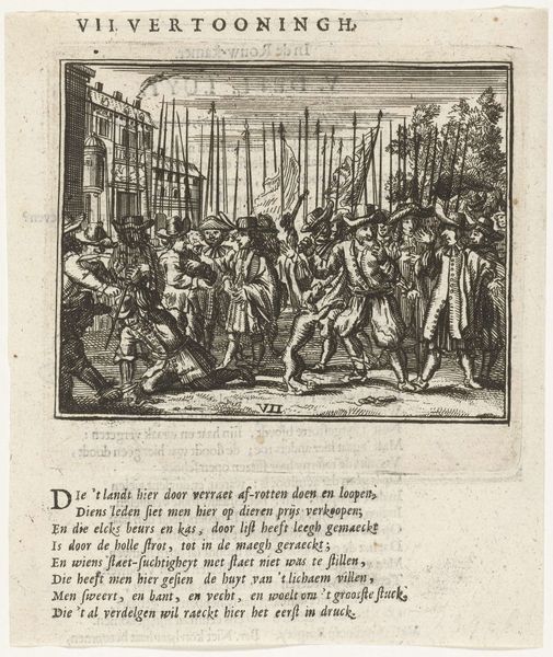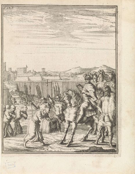 This engraving by Jan Lamsvelt depicts the murderers of Julius Caesar fleeing after their deed. Observe the obelisk, a symbol echoing back to ancient Egypt, representing power and memory. In the Roman context, obelisks were appropriated as trophies of conquest, later becoming Christian symbols of steadfast faith. Here, it stands adorned with medallions that capture the deed, turning a moment of political upheaval into a lesson, a memento mori, for those in power. Consider the raised arms and swords of the fleeing assassins, gestures laden with the raw energy of action and the weight of consequence. This motif of raised arms appears across epochs, from ancient battle scenes to Renaissance depictions of martyrdom. It signifies a moment of intense emotional or physical exertion, an appeal to the heavens, or a defiant challenge against fate. This primal gesture touches something deep within us, connecting to our own struggles and acts of defiance. The symbols in this engraving speak not just to the event itself but to the enduring human drama of power, betrayal, and memory. They remind us that history is not a linear progression, but a cycle where symbols and gestures resurface, evolve, and take on new meanings, connecting us to the past in profound ways.