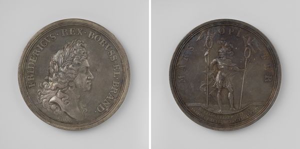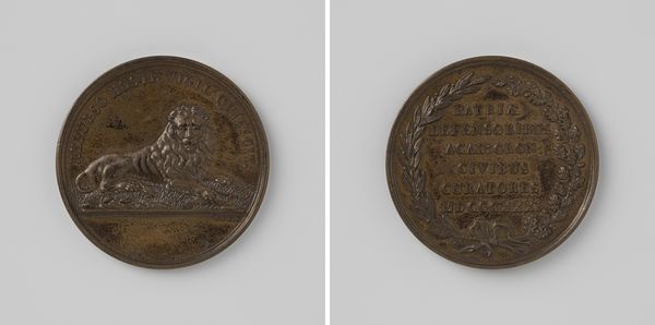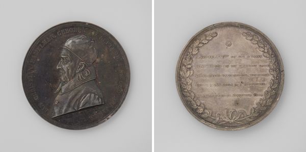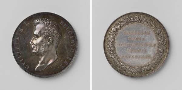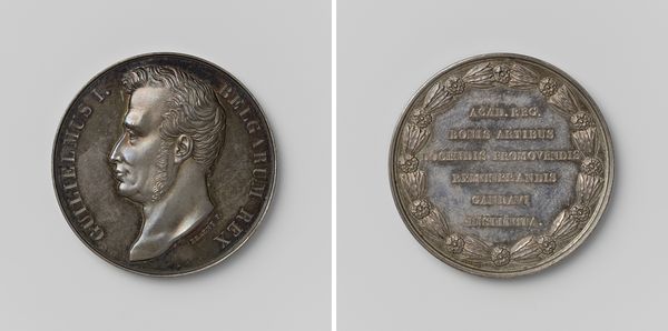 Curator: It's fascinating how medals like this one, commemorating the founding of the Royal Academy of Art in Brussels in 1817, act as miniature time capsules. Editor: It’s beautifully cast, I have to say. Even at this scale, there’s something grand and self-assured about it; an assertion of civic pride perhaps? Curator: Exactly! Created by Joseph-Pierre Braemt, it represents more than just an art school’s beginning. It symbolizes King William I’s effort to establish a modern cultural landscape under Dutch rule, after the fall of Napoleon. Editor: You can really see that classical influence; the bust is distinctly Roman in its idealization. Was this a common style for portraying rulers at the time? Curator: Very much so. Neoclassicism was the visual language of authority and enlightenment then. Notice how King William's profile dominates one side, inscribed with his name and title in Latin – a direct nod to Roman imperial coinage and portraiture traditions, signaling stability. Editor: The other side, with its Latin inscription celebrating the academy and its dedication to teaching the fundamentals of graphic arts, framed by this detailed wreath… It really speaks of aspirations of artistic and intellectual prowess, like a modern renaissance emerging. Curator: I see it as part of the wider phenomenon where rulers understood and used visual media – architecture, paintings and sculpture and certainly medals like this one – to embed narratives of legitimacy and continuity into the minds of people. This wasn’t only a boost for arts education but a powerful piece of royal public relations, skillfully blending national pride with artistic promise. Editor: Yes! It's like holding a piece of carefully crafted history in your hand – propaganda maybe, but wonderfully designed. It offers us a vivid window into how power communicated and perpetuated itself at that specific moment. Curator: Precisely. These objects remind us that artistic endeavors rarely exist in a vacuum. Understanding their political and social backdrop deepens our grasp of their lasting legacy and cultural significance. Editor: Absolutely. It reveals that the arts have always served diverse purposes; both beautiful and useful.