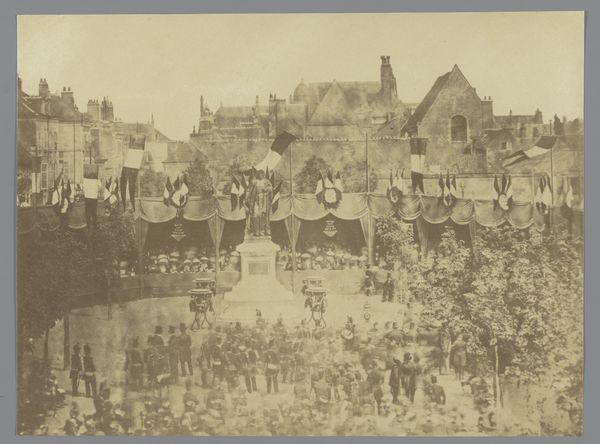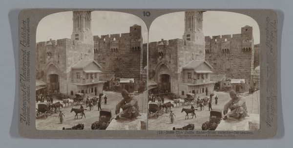 Curator: What a striking image—an almost ethereal landscape dominated by an imposing, fortress-like structure. We’re looking at an 1886 photograph titled “The Palace,” taken by Henry Hamilton Bennett. It’s part of the Minneapolis Institute of Art’s collection. Editor: My immediate thought is "winter wonderland, but make it authoritarian." It has the chilling majesty of a fairytale kingdom ruled by an ice queen. Curator: Interesting interpretation. For me, it’s deeply rooted in the specific social moment. This photograph depicts the Ice Palace built for the St. Paul Winter Carnival in 1886. The Carnival was conceived to demonstrate that Saint Paul, Minnesota was not only habitable but vibrant even in the harsh winter months. A defiant act against perceptions shaped during a time when many considered the northern states too inhospitable. Editor: Ah, a visual statement of civic pride, very much on the nose with the castle motif! But look at the medium itself; photography can freeze a moment and imbue it with symbolic meaning beyond its literal representation. It makes me think about ephemeral power, too—something constructed meticulously yet ultimately fleeting, vulnerable to thaw and change. Curator: Indeed. The ice palace became a symbol of ambition and communal effort—turning perceived weakness into strength. Consider the layers here. The symbolism behind the deliberate architecture versus its impermanence, which became a sort of poignant statement about society’s ambitions over time. And of course, this scene plays into the myth-making about America at that time as well. The picture freezes not just ice but a moment in societal confidence-building and boosterism. Editor: So it becomes a multi-layered icon, not just of a place but of an ambition? Even the photograph as a document elevates something transient into enduring visual culture. Makes one ponder which ice palaces we are busy erecting today. Curator: Exactly. It allows us to appreciate that the grandest symbols can be ephemeral while still encapsulating lasting human endeavors. Editor: It truly encourages a thoughtful reflection on resilience and perhaps, even defiance, embedded within an otherwise seemingly simple image.