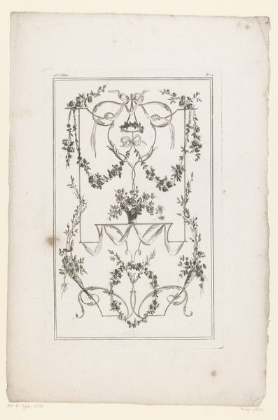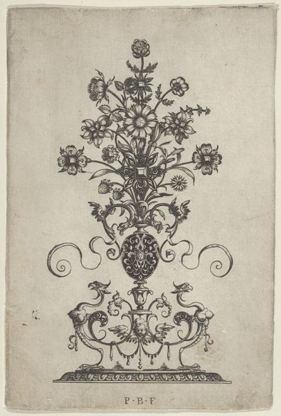 Editor: This is “Series of Small Flower Motifs, Plate 3,” an engraving by Paul Androuet Ducerceau, dating from between 1665 and 1675. There's a certain playful, almost dance-like quality to the floral designs. What captures your attention in this piece? Curator: You know, it's interesting you say 'dance-like'. To me, it whispers of a meticulously choreographed garden. Each bloom is a distinct character, poised just so. Look at the swirling tendrils – almost baroque in their exuberance – reaching out like hands in a minuet. Do you see the potential for these to adorn furniture or perhaps be woven into fabric? Editor: I do now! I was so focused on the individual flowers, I hadn't thought about them as a pattern, or potential for other decorative forms. The baroque influence is definitely strong, especially with the detail in the leaves. Curator: Precisely! Consider the era – decorative arts were exploding. These weren't just drawings; they were templates, dreams waiting to be realized in silver, silk, or stone. Think about the craftsman picking this up and imagining their own variation... What feelings do you imagine the artist might have had when making the work? Editor: Maybe a sense of providing resources, ideas, almost like sharing seeds for creativity. The engraving seems precise and yet free flowing. It’s like giving someone a set of building blocks for their imagination. Curator: Yes, and in doing so, Ducerceau, perhaps unwittingly, captures a transient, fugitive beauty. Think of the flowers themselves, fragile, fleeting – then immortalized in ink, endlessly re-imagined. Isn't that magical? Editor: Absolutely! It’s like freezing a moment of natural beauty and gifting it to future creators. It has definitely given me a deeper appreciation for decorative art's ability to inspire across time.