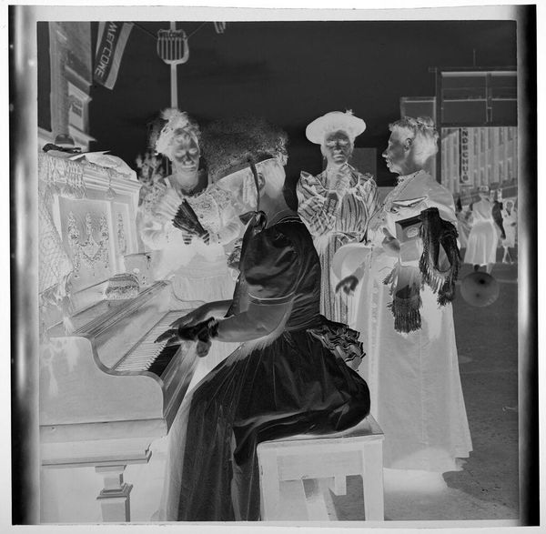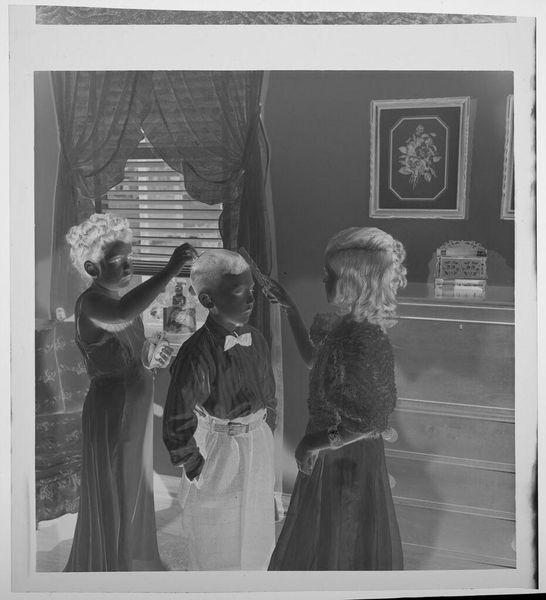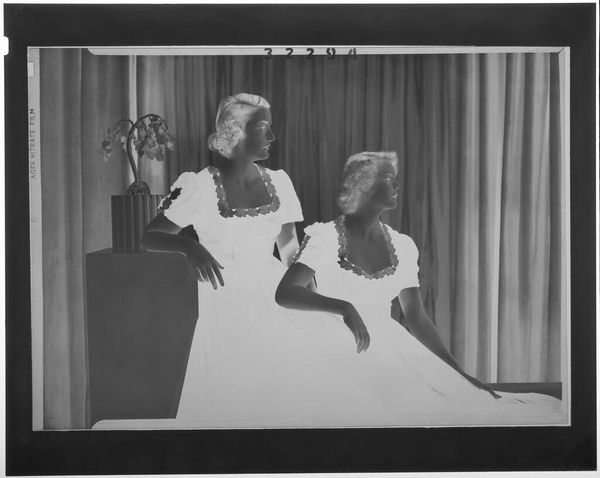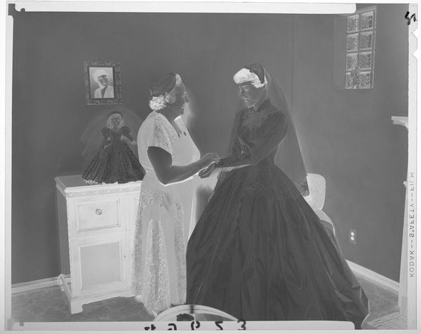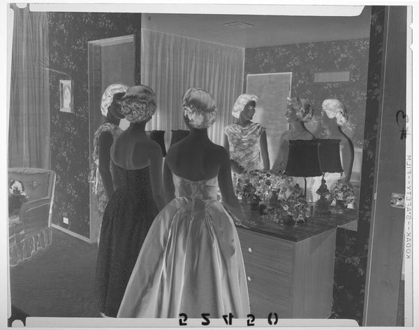 Curator: This is an intriguing, undated image by Martin Schweig, currently held at the Harvard Art Museums. It captures three young women in formal dresses within an opulent room. The mood is almost dreamlike. Editor: It looks like a reversed photograph, throwing off the light and shadows. The material of the dresses seems so heavy, like it could stand up on its own. What's the social context? Curator: Well, the dresses suggest a debutante ball or formal event. Schweig, whoever he was, likely moved within elite social circles to have gained such access, and this image functions as a record of that society. Editor: It’s more than just documentation. The dresses themselves signify status, consider the labor behind each stitch. Someone created them to be consumed and displayed, they are the physical manifestations of class. Curator: Absolutely, it's a performance of class. And photography itself became a tool for solidifying that performance, democratizing image-making while subtly reinforcing social hierarchies. Editor: I agree. The image makes me think about those involved in their creation - the tailors, seamstresses, and laborers whose work made such displays of wealth possible. Curator: Examining Schweig's work here, it seems he was aware of the complex social theater he was capturing, even if unintentionally. Editor: Indeed. It's a testament to how much an image can reveal, even when seemingly simple.