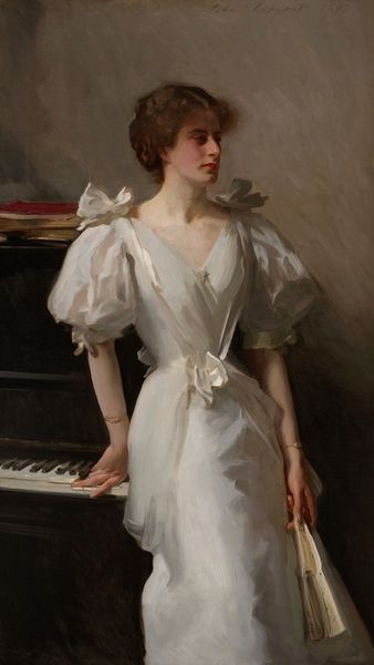 Editor: So, here we have John Singer Sargent’s portrait of Lady Speyer, painted in 1907 with oil on canvas. The lady is poised with a violin, set against a lush, almost dreamlike backdrop. The color palette is really beautiful with mostly whites and lavenders. I'm curious to know, what social and historical narratives are present in this work? Curator: That’s a great question. Think about the Edwardian era. What comes to mind? Sargent's portraits often served as visual records of social standing. Consider Lady Speyer’s dress, the almost carelessly sumptuous brushstrokes. It speaks of affluence, leisure, and a very particular performative role for women of that class. But there's more here than just surface portrayal. Editor: How so? Curator: Sargent strategically uses impressionistic techniques that both highlight and soften reality. The looser brushwork around her face might soften social critique through flattery. The grand piano suggests education and artistic refinement, qualities deemed desirable but often constrained by social expectations for women. Is it celebrating or subtly commenting on the limitations placed on upper-class women at that time? What do you think? Editor: I see what you mean! The detail in the face feels intentionally in contrast with the dress and the background. I hadn’t considered the performance aspect of the portrait, but you're right, she seems posed to evoke a sense of artistic accomplishment, reinforcing social expectations of upper-class women in this time. It's fascinating to see how art becomes a stage for societal roles! Curator: Exactly. This artwork is not just a depiction; it's a dialogue between the artist, the subject, and the audience within a specific historical framework. Examining how it reflects and subtly critiques those structures offers deeper understanding of its lasting power. Editor: Thanks, I see it so differently now! It's been enlightening to consider the social and political undertones layered within this beautiful portrait.