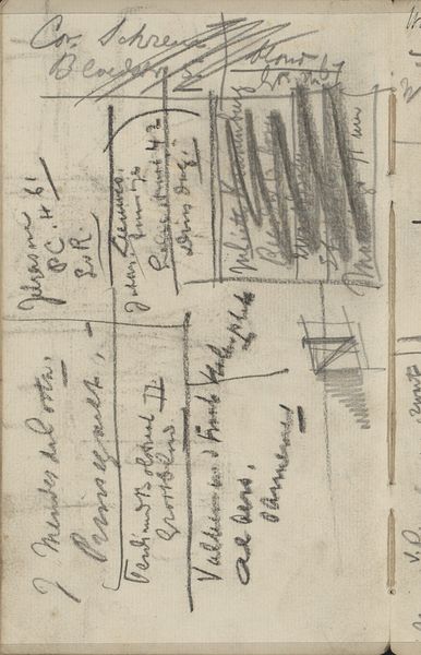 Editor: The gestural quality immediately captures my attention. Breitner’s Annotaties, created around 1894, seems to me like pure immediacy. Curator: Indeed, the artist has deftly used graphite on paper. Observe how Breitner utilizes the page—these rapid notations forming layers upon layers of impressions. Semiotically, the palimpsest reveals the act of thinking itself. Editor: I’m drawn to this apparent ephemerality; it offers an entry point into Breitner's world. The materials involved speak of function—a common sketchbook put to creative use. These aren’t the trappings of high art, but rather, the tools of the working artist, economically deployed. Curator: Note the deliberate composition within this perceived chaos, though. Observe the tension between the drawn marks and the white space—the way forms interact despite the loose arrangement, creating balance through asymmetry. Editor: What is the significance of the writing interwoven with the drawing? Curator: They function as codices. Perhaps these are notes from life drawing sessions, reminders, or a kind of visual inventory. Consider their contribution to the overall composition and rhythm, not just in denotation but as purely graphic elements. Editor: For me, the layering of information on the page encapsulates the artist’s process, highlighting how Breitner utilized modest and familiar resources to document his interactions and engagements within his surroundings. The materiality becomes both record and expression. Curator: Quite. A fleeting glimpse into an artist's mind transformed into a concise visual arrangement, its power stemming from the sophisticated negotiation between mark and space. Editor: Breitner’s notes certainly provide some valuable insights into the world from the artist’s unique perspective and experiences. Curator: An exercise in seeing.