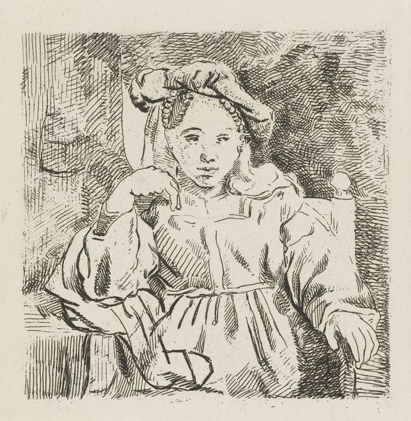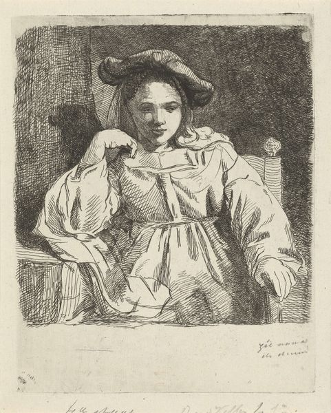 "Zittend Meisje" or "Seated Girl" was etched by David van der Kellen in the 19th century. Born in Rotterdam, van der Kellen lived during a time of significant social change in the Netherlands. The work depicts a girl seated in a chair with a thoughtful expression, and raises questions about the representation of women in art during that era. In what ways do images like this reflect societal expectations, gender roles, and power dynamics? Van der Kellen’s choice of subject matter and his artistic approach, invite us to consider the emotional and psychological dimensions of the girl’s experience. We can contemplate how art shapes or reflects societal issues, and we can acknowledge the individual humanity in each historical representation, considering that the emotional and personal dimensions of the piece may be lost.