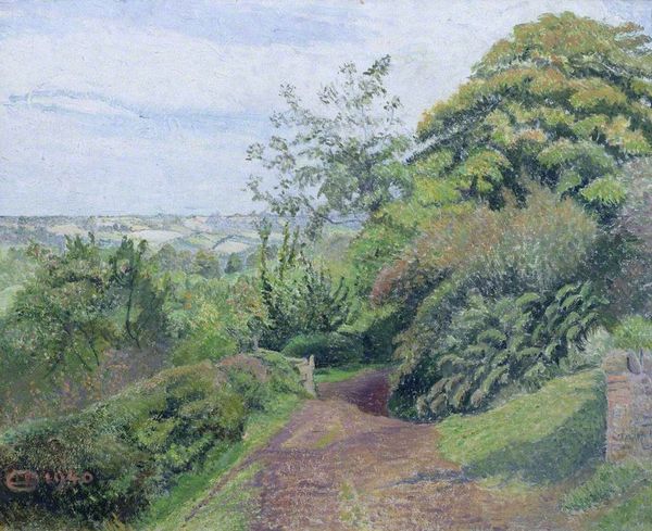 Lucien Pissarro created this landscape painting, likely in oil on canvas, capturing the essence of a cottage garden. The composition strikes a delicate balance between the foreground's vibrant, textured vegetation and the serene, muted tones of the distant hills and sky. The artist employs a varied palette, predominantly greens and earth tones, with subtle touches of yellows and blues that evoke a sense of natural harmony. Pissarro uses a network of brushstrokes, which do not simply imitate the forms of nature, but also interpret and restructure reality. The interplay between the detailed foreground and the soft background creates a visual tension. This tension may challenge traditional landscape painting conventions by blurring the lines between the real and the ideal, the present and the timeless. This subversion enriches the artwork's visual experience and provokes thought on how we perceive and categorize the natural world.