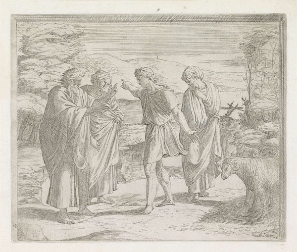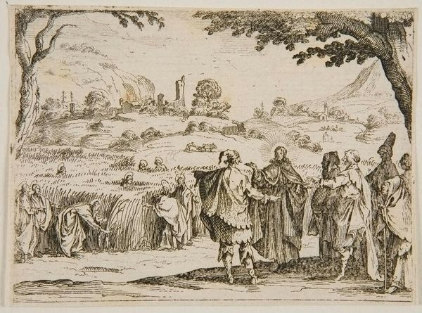 Curator: Jacques Callot's etching, "Christ Preaching on the Seashore," is rendered with such delicate detail. It's a bustling scene, isn't it? Editor: It feels incredibly still to me, almost dreamlike. The figures are so small, like little whispers in a vast landscape. Curator: The composition is striking. Callot masterfully employs the landscape to frame the figures, drawing the eye towards the sermon. Editor: And yet, Christ is nearly lost amidst the crowd. Maybe that's the point, right? The word spreading, carried on the wind. Curator: Precisely. Callot, born in 1592, captures a timeless narrative, a moment of quiet revelation amidst life's chaos. Editor: I keep thinking about how fragile this image feels. It's a reminder of how easily stories, faiths, and even etchings can fade.