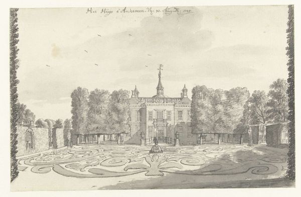 Jan de Beijer created 'De Riddermaetige Hoffstad Voorn', a pen and brown ink drawing, offering a panoramic vista of a stately Dutch residence. The composition is neatly divided into layers. The architecture with clean lines and geometric shapes is contrasted by the organic forms of the surrounding trees and foliage, rendered in softer washes of ink. The linear precision used in the architecture is notable, each stone meticulously outlined. Look how the artist utilizes perspective to create depth, drawing our eye from the detailed foreground to the less defined background. This methodical approach reflects the 18th-century Enlightenment's emphasis on order and reason, but the picturesque qualities also suggest a romantic sensibility. The drawing functions as both a record and an interpretation, inviting viewers to appreciate the formal beauty of the structure and its harmonious integration within the landscape. It reveals a period of transition, capturing the structured yet evolving relationship between humanity and nature.