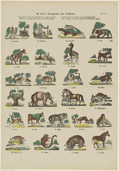 Editor: This etching from between 1856 and 1900, titled "Zie kinders in deez' prent...", attributed to Glenisson & Zonen, shows a grid of fanciful animals. The creatures look half real and half like they're from a child's imagination. What can you tell me about it? Curator: What immediately strikes me is how these creatures aren't simply zoological illustrations. Each one is bisected, almost like a diptych within a single image, showing two potential realities for each animal. Do you notice how half of each animal is 'realistic' in color, and the other is tinged with fantastical green or yellow? Editor: I see that now! It's almost like a before-and-after, or maybe a "what if" scenario played out on each animal. What does that division signify? Curator: Perhaps it's an exploration of nature versus imagination. The artist seems to ask, "Where does the animal end and the idea of the animal begin?" These vibrant colours hint at the transformative power of stories and folklore on our understanding of the natural world, shaping how we perceive these creatures. Editor: That's fascinating! The image isn't just showing us animals, but how our minds interpret and sometimes distort reality. Curator: Precisely. It's a visual representation of the narratives we weave around these creatures, perpetuating cultural beliefs and even fears, reflected across time. Even now we associate colour to species: imagine the symbolism a Bengal tiger may have when considering that one of the regions where this animal dwells in Bangladesh and its National Colour is Green. This engraving is as much a study in psychology as it is a catalogue of animals. Editor: I never thought of it that way. This little print contains a whole world of symbolism! Thanks for pointing it out.