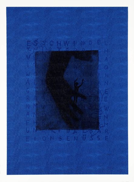 Curator: Before us is Lawrence Daws' screenprint, "Pacific Eye," held in the Tate collection. Its dimensions are roughly 610 by 613 millimeters. Editor: It's rather disquieting, actually. That immense, fleshy form dominating the churning blue… It evokes a sense of submerged power. Curator: Indeed. Daws manipulates perspective, juxtaposing the macro—that fleshy form you mention—with the implied vastness of the ocean below. The abrupt cropping only heightens the tension. Editor: The hand, or the suggestion of one, appears almost godlike, looming over the water. Is it benevolent, or threatening? The eye shape is ambiguous, perhaps even lunar. Curator: Precisely. The artist uses negative space to imply meaning, asking us to consider how we interpret form and void in equal measure. Editor: It’s a memorable image, one that resonates with primordial fears and perhaps a reverence for the unseen forces of nature. Curator: A striking piece that showcases Daws' exploration of perception and the subtle manipulation of compositional elements.