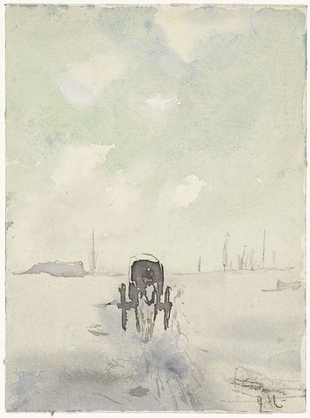 Jozef Israëls rendered this beach scene with rider and bathing chairs in watercolour. Its washes of muted greys and browns evoke a quiet, contemplative mood. Look closely at the horizon line which is not clearly distinguished from the sky, creating a flattened perspective. The figures and objects are lightly defined, almost dissolving into the misty atmosphere. This indistinctness destabilizes any fixed interpretation. Such formal ambiguity can be related to contemporary philosophical shifts toward questioning stable meanings. Like the literary naturalists, Israëls seemed intent on capturing the transient and contingent nature of existence. Observe how the diffuse light obscures the details of the bathing chairs, rendering them more as abstract blocks of colour. This emphasis on formal elements over clear representation speaks to a modern sensibility which increasingly valued subjective experience over objective depiction. The work invites viewers to consider the ways in which perception shapes reality.