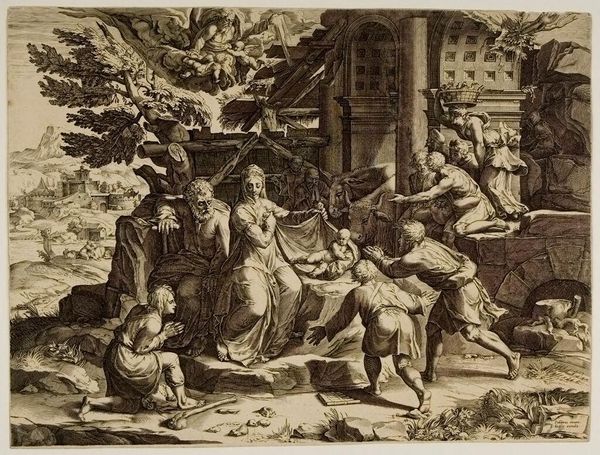 Editor: This is Nicolaes de Bruyn's "S. John Preaching in the Wilderness," housed at the Harvard Art Museums. The detail is incredible. What strikes me is the sheer labor involved in creating such an intricate print. What do you see in it? Curator: I'm drawn to considering this image as a commodity. The process of engraving, requiring skilled labor and specialized tools, speaks volumes. Consider the accessibility – prints like these allowed for wider dissemination of religious narratives. Who was the intended audience, and how did the materiality of the print influence their reception of the message? Editor: That's fascinating! I hadn’t considered its role in disseminating religious ideas. Curator: Exactly. By examining the means of production, we gain insight into the social and economic context in which this artwork was created and consumed. Editor: Thanks, I'll definitely look at art differently now.