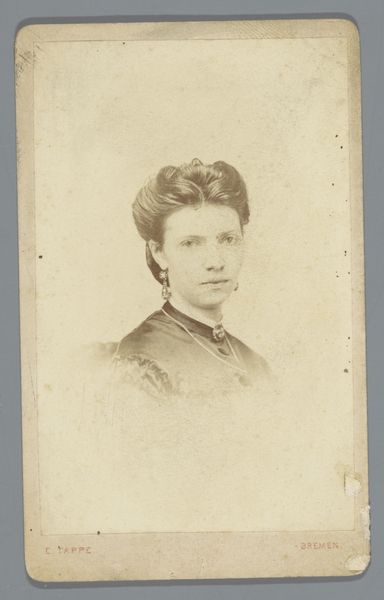 Curator: Here we have an albumen print dating back to 1865, entitled "Portret van Frans Swaenen," by Stalins & Janssens. It offers a fascinating glimpse into the visual culture of the mid-19th century. Editor: It’s remarkable, isn’t it? The subtle sepia tones create a strong sense of nostalgia. The oval frame within the rectangular paper further isolates the subject and draws attention to the gaze. Curator: Exactly. Photography at this time served very specific purposes. Portraiture became democratized, giving access to broader representation that was often tied to social identity and aspirational values. You’ll note Swaenen is adorned in a tailored suit; there is likely a purpose in staging him this way. Editor: The flatness is also quite striking. Without the dynamic range of light, the details on the suit fade into the dark ground behind it. One starts to discern geometric relationships—the circle that encloses him, the triangles that structure his chest—to piece the form back together. Curator: And who was Swaenen, we may ask? Without further metadata on this photographic practice, there is still much unknown about his positioning and influence. What is sure, though, is that this image marks a certain societal footprint, where the bourgeois citizen utilizes photography to signify self-image and permanence. Editor: There is a lovely imperfection to the edges as well, a roughness that exposes its material composition—it seems like he's in a bubble that could pop at any moment. Given the way the light sits, and his centered position, I am led to believe this aesthetic outcome was intentional. Curator: Perhaps Swaenen or the artists intended to create that sense of temporal and historical relevance, while making him seem approachable by those viewing from the present. There’s a distinct interaction and statement on Swaenen's place in society communicated here, not only for the mid-19th century but also for us as audiences today. Editor: By understanding those subtle yet crucial geometric relationships—oval within rectangle, shadow and light—we start to reconstruct an archive based on semiotics. It moves toward building an aesthetic register about this man and his time. Curator: Indeed, a portrait unveiling the intersectional dialogues of identity, representation, and visual culture. Editor: An exquisite specimen; it showcases the potential of early photography.