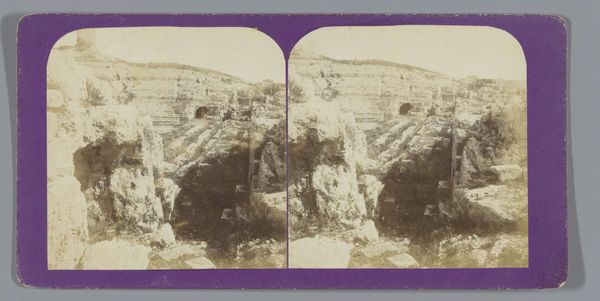 Editor: We're looking at "Gezicht op de entree aan de oostzijde van het Griekse theater van Syracuse" by Jean Andrieu, dating from 1862 to 1876. It's a gelatin-silver print, part of a stereograph. The light in this photograph, or pair of photographs I suppose, is incredibly striking! It creates such a dramatic effect, highlighting the textures of the stone. How do you interpret this work in terms of its structure and composition? Curator: Indeed. Observe how Andrieu employs the stereographic format not merely as a representational tool but as a device that enhances the very structure of perception. The duplicated image, with its subtle variations, compels the eye to oscillate, thereby underscoring the architecture's inherent geometry and the palpable presence of light and shadow. Note how the archway acts as a frame within a frame, leading the viewer's eye towards a distant vista. This nested structure directs our gaze but it also highlights the material nature of the photograph itself as a constructed object. What significance do you ascribe to this play of depths and surfaces? Editor: Well, I find that it calls attention to how the photograph presents this physical location not as a seamless scene, but as a compilation of constructed views and architectural elements. Can we then also address how this composition highlights a tension between documentation and artistic interpretation? Curator: Precisely. Andrieu’s photographic approach isn't simply a record of architectural space but a conscious arrangement of elements. The controlled tonality and perspective, typical of gelatin-silver prints, further abstract the site, accentuating form over pure documentation. Do you find that this emphasis changes our interaction with the image and the depicted theater itself? Editor: Yes, because I now feel prompted to think about photography itself as a constructed, interpreted, and intentional creation, not a "snapshot". It prompts considerations about medium and artistic decision. Thank you for illuminating those facets for me. Curator: You’re welcome. I found our discussion rewarding. By focusing on the formal attributes, the materiality, we’ve elucidated Andrieu’s vision and its aesthetic intentions in ways I hadn't previously fully appreciated.
