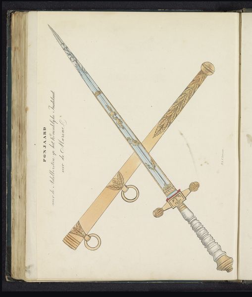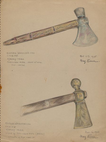 Curator: Looking at Robert Jacob Gordon's watercolor and ink drawing from possibly between 1777 and 1786, we see three meticulously rendered knives alongside their sheaths. The artwork is titled "A Tswana or Kora knife with its sheath." Editor: I’m struck by how delicate these images are, considering the probable function of the objects depicted. The intricate ornamentation, the rendering of textures in watercolor… it’s a fascinating juxtaposition. Curator: Absolutely. Gordon, a Dutch military officer and explorer, documented extensively the indigenous populations and artifacts he encountered in Southern Africa. These knives provide insight into the material culture and artistic expression of the Tswana and Kora people. They offer a window into their social structures, status symbols, and perhaps even their spiritual beliefs. Editor: Indeed. Focus on the central knife sheath—see the figure carved on its surface? There’s a geometric quality to it, almost abstract. Below, an elongated creature… It makes me wonder about the semiotic intention and artistic conventions employed. Curator: Those visual elements speak to a symbolic language inherent in the object’s creation. Each motif likely carries a specific meaning within the cultural context of its origin, reflecting social norms and cultural identity. The imagery could be tied to lineage, achievements, or even protection. Editor: I agree. However, the presentation flattens these elements, treating them as formal components—shape, line, and form creating pleasing arrangements regardless of context. Consider the negative space; its function complements the designs… There’s a graphic elegance in its simplicity, irrespective of symbolism or intention. Curator: A necessary observation, to be sure, as European conventions also color our interpretation. Colonial viewpoints inevitably impacted the framing and description, and, potentially, even the choices Gordon made in which objects to record, which contributes to how we comprehend them today. Editor: And from a formal standpoint, the slight color variations unify the series despite variations in pattern and object type; an intentional composition yielding balance and elegance. It's intriguing to observe how the image functions independently. Curator: Seeing them isolated within the page allows reflection on what’s there but also about what’s missing, the broader context that continues to challenge and inform. Editor: An exquisite reminder how much richness we discover through blending form and function!