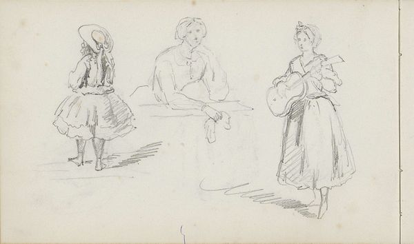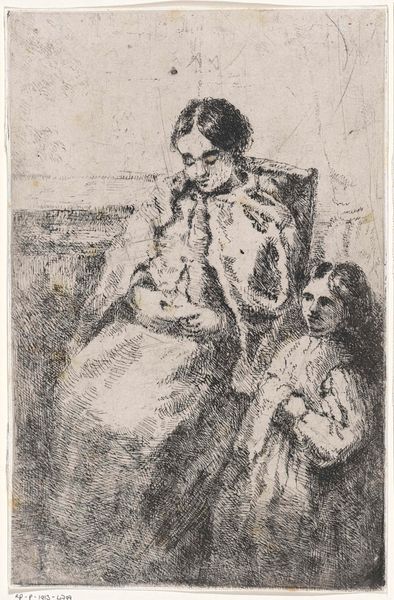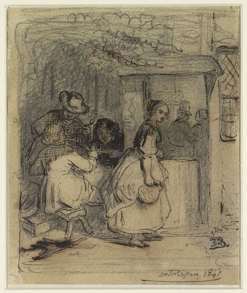Editor: Here we have a drawing titled "Handwerkende meisje en drie kinderen zittend op een bank met gekruiste armen," made sometime between 1865 and 1913 by Bramine Hubrecht. It’s a pencil and charcoal drawing. What strikes me is the somber mood; the children seem withdrawn. How do you interpret this work? Curator: There is a clear visual narrative here, steeped in symbolic weight. Notice how the seated children, arms crossed, almost mirror each other – a signifier of solidarity or perhaps shared weariness. Consider the lone figure of the girl working; her activity – likely mending or crafting – points towards themes of domestic responsibility and perhaps even economic hardship. Do you see a hint of resignation in her bowed head? Editor: I do, now that you mention it. And there's another face, barely sketched, in the background... what's the meaning? Curator: That spectral presence is fascinating. It could represent memory, perhaps a deceased parent or a sibling, whose absence permeates the scene. The drawing's muted palette adds to this sense of lingering sorrow, embedding layers of emotional depth within a seemingly simple genre scene. This isn’t merely a picture of children; it's a window into the complex emotional landscape of a family facing hardship. Can you see now how seemingly simple depictions carry generational memory? Editor: That’s incredible, I see so much more than I did at first. Thanks for helping me explore it! Curator: My pleasure. It’s a potent reminder that even seemingly mundane scenes are laden with meaning if you only know how to look for it.