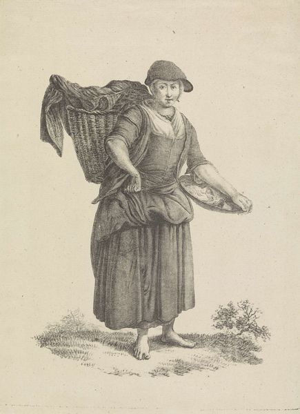 This is a delicate etching by J. van Strieland, depicting a woman standing in water, a basket in her arms. The method of etching itself is worth considering. An etching is made with acid, eating into the surface of a metal plate. The artist protects certain areas with a waxy ground, allowing the acid to bite into the exposed areas, creating lines and textures. This requires careful labor, precision, and control of the materials. The resulting print, with its fine lines and subtle shading, is evidence of the etcher's skill and craft. Notice how the process affects the final image. The lines are not bold or assertive, but rather delicate and nuanced. This softness gives the image a dreamlike quality, which in turn lends a certain dignity to the peasant subject. While the etching is small, the artist's labor and the qualities of the medium provide an intimate glimpse into a specific time and place. This artwork encourages us to consider the value of craft and the dignity of labor.