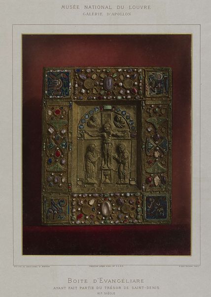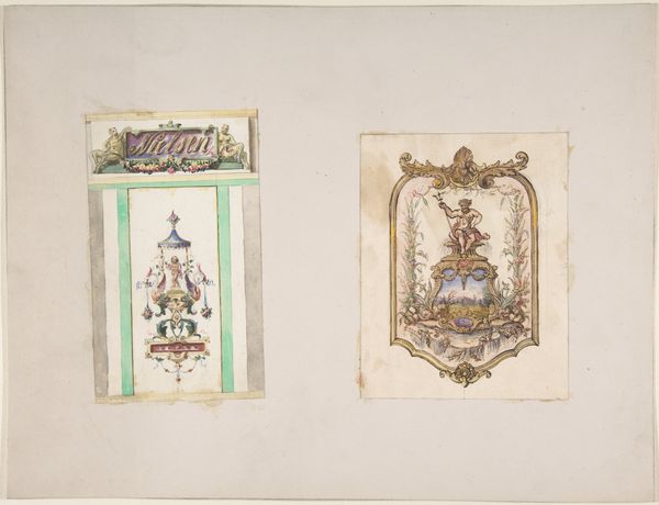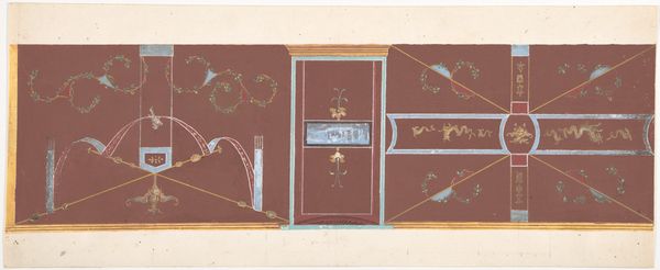 Jules-Edmond-Charles Lachaise rendered these panel designs using watercolor and graphite, likely in the early 20th century. The materials are traditional to the fine arts, yet the subject matter points to the decorative arts. Lachaise probably used a fine brush to achieve such detail; the gold leaf effect in the central panel is particularly well-rendered. Note the contrast between the linear patterns in the top and bottom panels, and the more elaborate central design, featuring miniature portraits. The use of watercolor allows for translucent layers, creating depth and luminosity. The graphite under-drawing suggests a methodical approach, emphasizing precision. Lachaise likely drew on historical references, appropriating motifs from different eras. This speaks to the revivalist trends in design at the time. Ultimately, this work demonstrates a skillful melding of artistic and artisanal practices, underscoring how so-called “fine art” and “craft” are interconnected, not separate.