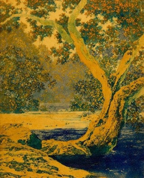 Curator: Well, this feels like stepping into a dream. Look at this dreamlike summer landscape painted by Maxfield Parrish in 1908, simply entitled "Summer." It looks to be oil on board, in an impressive example of his fantasy-romantic style. Editor: Absolutely dreamy! That hazy light, the delicate palette…it's like a memory half-forgotten. I’m immediately struck by how ethereal the figure feels against that slightly artificial-looking waterfall. There is a slightly haunting mood, as if this Eden is slowly fading away. Curator: Yes, Parrish was quite interested in idealizing youth and nature. The idealized figure evokes classical mythology, and its title fits into larger thematic narratives. Consider how Parrish and other illustrators of the era created idyllic visions for a rapidly modernizing society; escapism through idealized forms. Editor: Mmm, “escapism”… yes. But the rigidity of the figure bothers me slightly. Is she real or another part of the fantasy? The light almost seems to slide right off her form. It's undeniably beautiful, of course; the composition's use of framing is very appealing. Curator: The landscape and the treatment of the figure display Parrish's technique for layering translucent glazes. What's remarkable to me is that, by emphasizing artifice in this manner, Parrish's visual escapism almost speaks to a latent dissatisfaction. Editor: Maybe a dissatisfaction with the fleeting nature of beauty? Or youth, specifically? She nestles her nose against the roses… but almost tentatively, like a deer testing for danger. Curator: Perhaps a premonition of sorts? Or the acknowledgment of its constructed nature? The artwork reflects societal desire, particularly within the expanding role of commercial visual imagery. Editor: I like how you’re putting this in historical perspective because now I find myself pondering what this imagery would have communicated to an audience back then, during those rapidly transforming times. I appreciate how it almost vibrates with quiet, yet palpable energy. Curator: Exactly, and with it a visual representation of summer that leaves an enduring presence. It is a powerful comment, and still resonant today. Editor: Indeed. So much for fleeting summer... these lingering reflections will definitely be what I take away from this encounter.