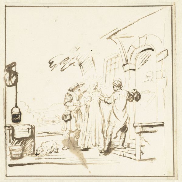 Moses ter Borch created this drawing, “Maaltijd te Emmaüs,” with pen in gray ink and gray wash. The composition, contained within a square format, immediately draws your eye to the figures seated around the table. The dramatic expressions of the three figures, rendered in stark grayscale, create a dynamic tension. Notice how Ter Borch’s strategic use of light and shadow animates the scene. The artist masterfully employs chiaroscuro to highlight moments of revelation, drawing from the tenebrism popular in the Baroque period. This technique is particularly noticeable in the upturned faces and gesturing hands, which are thrown into sharp relief. By emphasizing the contrast between light and darkness, Ter Borch encourages a reading of the image through a lens of spiritual awakening and the dichotomy between ignorance and knowledge. The very structure of the artwork challenges us to consider how visual forms can be imbued with layers of cultural and philosophical significance.