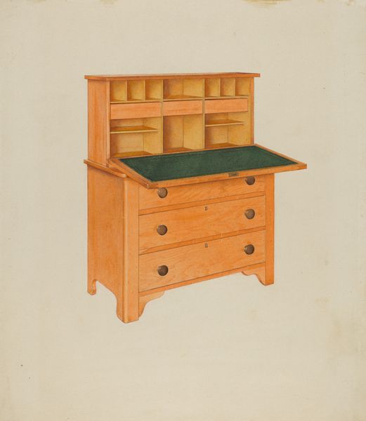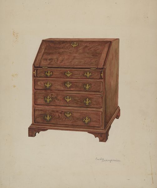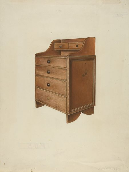 John W. Kelleher made this drawing of a Shaker Chest of Drawers sometime in the 20th century using graphite, watercolor, and possibly gouache. It depicts a simple wooden structure featuring clean lines, minimal ornamentation, and a light finish, all characteristic of Shaker design. The Shakers, or the United Society of Believers in Christ’s Second Appearing, were a religious sect that valued simplicity, utility, and honesty in all aspects of life. Their furniture reflected these values. In the context of American social history, Shaker design emerged as a critique of the excess and artificiality of mainstream Victorian aesthetics. This chest, with its focus on function and craftsmanship, embodies a utopian vision of a society ordered around spiritual values. Examining archival materials such as Shaker community records and furniture catalogs can deepen our understanding of how their beliefs shaped material culture. By considering the social and institutional history behind this image, we can gain insight into the values and ideals that continue to influence design today.