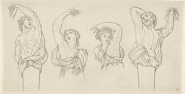 Curator: Well, this Ferdinand Hodler graphite drawing, called "Study for A Glance into the Infinite" from around 1915 and now residing here at the Minneapolis Institute of Art…it’s quite striking, isn’t it? It gives me such a sense of space. Editor: It's evocative. Immediately, I’m struck by the rhythmic repetition and how the linear quality creates movement, almost like figures in a procession or dance. The women’s upward gazes reinforce this sense of reaching for something beyond. Curator: Exactly, Hodler was heavily influenced by symbolism and developed a concept he called "Parallelism." You see it here, don't you? How he repeated forms to express harmony and unity reflecting his anxieties amid WWI? He used it almost as a tool of national identity and collective experience. Editor: Yes, and how striking he captures emotion simply through gesture and pose. The delicate graphite lines describe form, but they also delineate psychological space. Each figure projects introspection. The variations among them despite the similarities create depth, perhaps of experience or time. Curator: Absolutely, during this period, the changing social and political dynamics had created a space where Hodler, amongst others, reflected on mortality, especially relevant as Switzerland remained neutral in WWI while other European nations engaged in a deadly conflict. I wonder how Hodler perceived women's role during these challenging times. Editor: Perhaps it is the artist inviting us to consider something both personal and universal. The ethereal forms encourage me to investigate not only its aesthetic, but also the spiritual connection Hodler invokes using relatively simple composition and media. Curator: Seeing "Study for A Glance into the Infinite" with you always enriches my view. Highlighting the socio-political impact in 1915 and interpreting Hodler's possible commentary. Fascinating indeed. Editor: And for me, seeing it through your eyes offers an even more profound emotional reading of Hodler’s formalism, especially with your pointing out of a reflection of turmoil into hope, from each ascending figure. I am reminded that infinite interpretation of the infinite may be all there ever is.