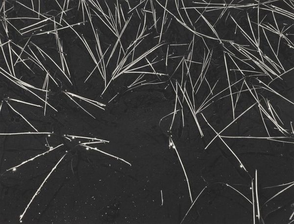 Editor: This is Harry Callahan's "Grasses, Wisconsin" from 1959, a gelatin silver print. It's almost abstract, with these delicate lines of grass against a dark background. There's a sense of rhythm, but it also feels stark. How do you read this image, given the socio-political context of the late 50s? Curator: Well, considering the socio-political landscape of the late 1950s, it's interesting to view this not just as a simple landscape, but as a potential commentary on conformity. Callahan was photographing during a time of intense social pressure, and the uniformity and repetition in this field of grass could be seen as a subtle reflection of that. Do you think that’s plausible, given photography's evolving role in social documentation at the time? Editor: That’s a thought-provoking take. I hadn’t considered the grass representing conformity, I was focused on its natural beauty and how that relates to realism and the natural texture. But your point makes me consider the intent behind choosing this seemingly mundane scene. Curator: Precisely! Callahan often photographed familiar subjects - his wife, Eleanor, nature. But the "how" is critical. Here, he's isolated these blades of grass, making them stand for something more. How was realism in art perceived at the time? As objective truth, or capable of carrying subjective meaning? Editor: I suppose viewers likely regarded realism in photography as offering more objective documentation of ordinary life. Now I'm really seeing your interpretation of Callahan making a comment through an objective means of documentation, with those subtle undertones. That is super fascinating! I never looked at realism this way before. Curator: Exactly, the power of art lies often in these layered meanings. And questioning established ideas opens our eyes to a broader range of interpretation, doesn't it? Editor: Yes, thank you for that fresh look!