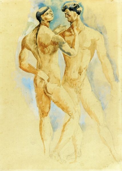 Here, in this rather large painting, Picasso gives us "Teenagers," or what looks to me like a meditation on form, painted with oils. Look at that limited palette! It's like he’s wrestling with form in warm monochrome, pushing and pulling at the edges, building these figures from the ground up. I get a strong sense of process, here. See how the ochre paint feels scrubbed into the canvas, almost like a fresco? The bodies emerge from it, and the sketchy lines suggest constant adjustment, like the painting itself is a search. The figure on the left, with arms raised, feels so present and vulnerable, while the other, carrying a pot, seems more remote, like a memory. It reminds me a little of Cezanne, in the way he reduces figures to geometric volumes, but with a rawer, more urgent energy. It's not about capturing a likeness, it's about the act of seeing, and the struggle to translate that vision onto the canvas. It's a reminder that art is never finished, only abandoned.