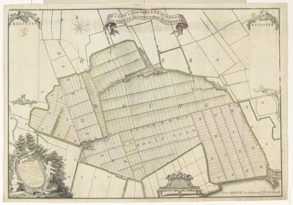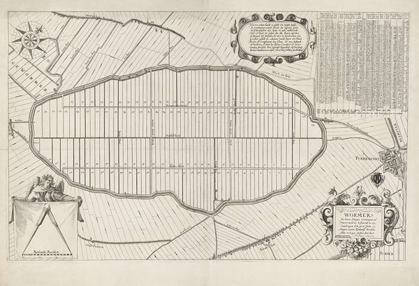 Editor: Here we have "Kaart van de Wieringerwaard," a print made sometime between 1669 and 1713. It’s incredibly detailed; it almost looks like an early geographic information system. I’m curious, beyond its obvious function, what can you tell me about this map in terms of its cultural significance? Curator: This map, though seemingly utilitarian, speaks volumes about the social and political landscape of the Dutch Golden Age. Land was power, and mapping was a tool of control. Consider who commissioned this: landowners eager to quantify and solidify their holdings. This isn't just about charting geography; it's about claiming and legitimizing territory within a complex system of property rights. Notice the precise geometric divisions. What does that precision suggest to you? Editor: A desire for order, perhaps? And control. Everything's clearly delineated, leaving little room for ambiguity. Curator: Exactly. And what about those small illustrations in the corners – the livestock, the laborers? They romanticize agricultural life but also subtly reinforce a social hierarchy, a visual reminder of who benefits from the land and who toils upon it. We must also think about how land reclamation projects during this period affected local communities. The creation of "new" land wasn't always a positive thing. Editor: I hadn't thought about the social impact of land reclamation... I guess a map is never just a neutral representation. It always carries a point of view. Curator: Precisely! By acknowledging that embedded perspective, we engage critically with the historical context. Understanding these power dynamics helps us to grasp the broader narratives shaping the Dutch Golden Age, from economic expansion to social stratification. Editor: This makes me want to look more critically at maps, especially old ones, and ask whose story they are really telling. Thank you! Curator: My pleasure. And remember, history resides in the details!