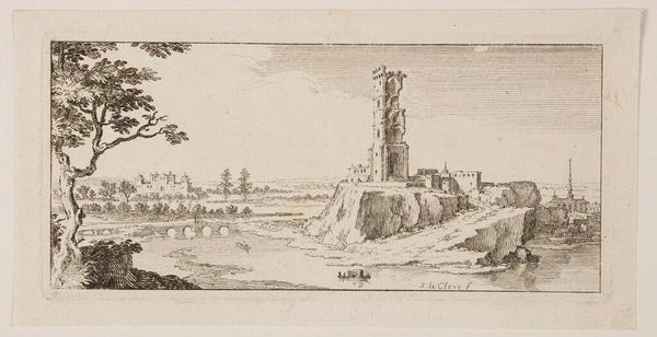 Curator: This is "Frozen River to the Left of a Square Tower," an etching by Esaias van de Velde, created sometime before 1630. It’s a small plate, roughly 11 by 18 centimeters. Editor: My first impression is of a cold, sparsely populated scene, the scratchy lines of the etching adding to that sense of bleakness. Curator: The tower itself, though crumbling, suggests the enduring presence of human construction against the elements, echoing perhaps the artist's vision of permanence within transient landscapes. Editor: That tower, though, looks rather forlorn. I'm drawn to the material reality of its decay, the way the stone erodes, reflecting the slow, relentless pressure of time and weather on even our most solid constructions. Curator: Absolutely. Consider how the figures on the ice, playing some sort of game, represent the fleeting human element amidst the imposing, enduring architecture and natural setting. Editor: It's interesting to think about how prints like this were produced and circulated, making these scenes accessible to a wider audience, connecting urban viewers to rural life and landscape. Curator: This is a work where symbolism quietly intersects with the everyday, asking us to reflect on our place within a much larger and older narrative. Editor: Indeed, and appreciating the craft—the etcher's labor and the material's resistance—adds another layer to our understanding of this seemingly simple scene.