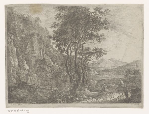 Louis de Châtillon created this landscape with three monks, date unknown, using etching techniques. The monochromatic print invites us into a world defined by its intricate details and tonal variations. Note how the composition is structured through a play of light and shadow, leading the eye from the foreground, where the figures of the monks are placed, towards the distant, elevated fortress. Châtillon employs a delicate balance between the organic forms of nature and architectural elements. The artist uses line work to define shapes and textures, creating a sense of depth and perspective. The varying densities of lines suggest different materials and distances; the dense, tangled vegetation contrasts with the sharp, angular forms of the buildings. This tension between the natural and the constructed may explore themes of human intervention within the landscape. The print invites multiple readings, and its enduring appeal lies in its formal complexity and the visual dialogue.