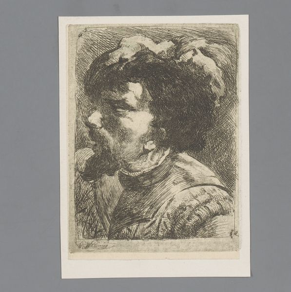 Curator: This is Willem Linnig's "Portrait of an Unknown Man with a Headscarf," dating from the late 19th century. It's an ink drawing on paper, currently held at the Rijksmuseum. Editor: There’s something quite arresting about the gaze. He looks almost wary. How should we interpret this portrayal within the context of 19th-century portraiture? Curator: The directness of the gaze is key. Think about the rise of realism and its connection to broader social shifts. Portraiture, historically a tool of the elite, began to explore a wider range of subjects. The 'unknown' man here moves portraiture beyond traditional status displays. How do you see the headscarf playing into this? Editor: I see the headscarf giving a sense of, maybe, exoticism or... otherness? It feels like the artist might be signaling something about the man’s cultural background, perhaps unconsciously reinforcing stereotypes. Curator: Precisely. The “unknown” is as significant as the headscarf itself. Without a name or context, the figure becomes subject to projections. This kind of image circulated in a time when European society was rapidly classifying people and constructing racialized identities. So, who benefits from this ambiguity and categorization? Editor: That makes me reconsider my initial assumptions. I had just taken the image at face value without thinking about who had the power to frame his image. It’s less about him and more about how he's being perceived and presented. Curator: Indeed. Linnig gives us a fascinating glimpse, not just of a face, but into the dynamics of seeing and categorizing in the 19th century. Editor: I now understand better the sociopolitical forces in realism, especially concerning who gets to be seen and how. Curator: And how these choices shape the way we interpret the work over a century later.