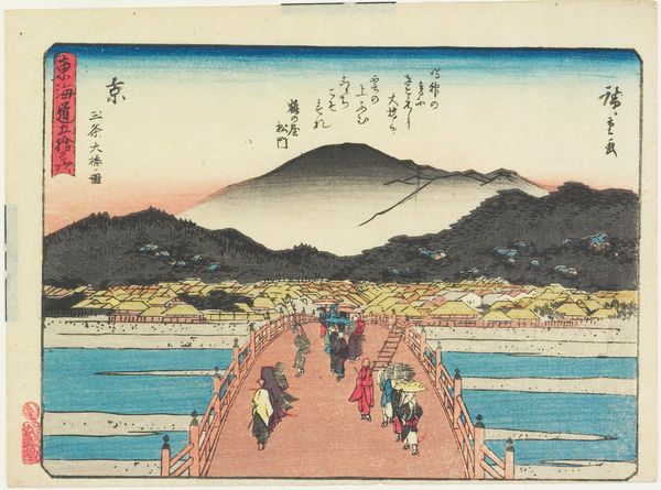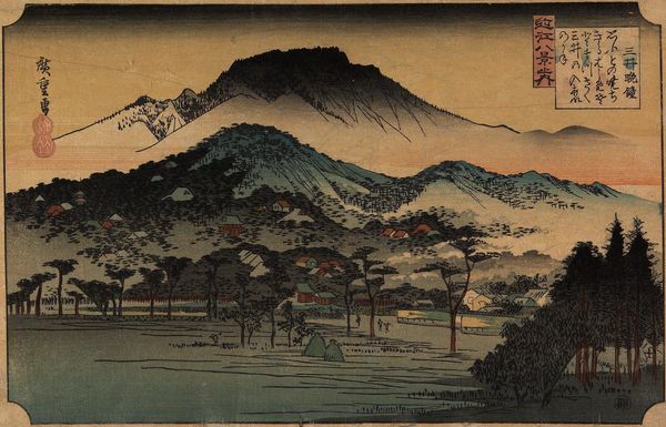 Editor: So this woodblock print, "Ferry Boats at Fuji River in Sunshū Province" by Utagawa Hiroshige, dating to about 1837, feels quite peaceful, despite the depiction of human activity. There’s a strong emphasis on the relationship between labor and the natural landscape. What do you see as particularly significant here? Curator: Looking at this print, I'm struck by how it exemplifies the commercialization of landscape. The woodblock printmaking process itself – the carving, inking, and printing – was a labor-intensive craft, and these prints were produced for a burgeoning consumer market. How do the figures on the boats, their activity, contribute to the overall meaning in the context of their economic production? Editor: They definitely feel integral. Not just scenic elements, but small contributors to a larger network. Do you think the choice of materials, like ink and wood, held particular significance for Hiroshige? Curator: Absolutely. Wood as a material connects to a wider ecosystem, not just within the frame but extrinsically as well; where was that wood sourced, who harvested it? Ink as well— what processes contributed to that production? Further, think about the dissemination of these prints. They were commodities circulated widely. Editor: So the value isn’t just in the aesthetic image, but in understanding it as part of this larger system of labor and consumption. Curator: Exactly. And it's worth considering how this perspective shifts our understanding of landscape art, away from mere aesthetic appreciation to a recognition of the material conditions of its making. Does considering that shift how you look at it? Editor: Yes, totally! I’ll never look at landscapes the same way now. I see it beyond pretty nature and think of who made the work, how it got here, the processes that made the image possible. Curator: I hope that understanding changes how you perceive the world, and not just artworks.