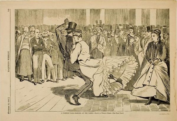 Curator: Winslow Homer's "A Parisian Ball – Dancing at the Casino" from 1867, printed in "Harper's Weekly," captures a lively scene. It's an etching, so the fine lines create detail and texture, inviting a very close look. Editor: Right, my first thought: whirling! A blizzard of petticoats and top hats. But the dancers are framed by a sea of faces, some admiring, others rather… bored? Curator: Indeed. Note the contrast between the kinetic energy of the couple and the static observation of the onlookers. Homer employs a limited tonal range, emphasizing line to convey movement and the rigidity of the formal attire. This tension could be interpreted as a commentary on social norms restricting individual expression, even in moments of leisure. Editor: Exactly! It’s like the dance floor's a stage, and the audience is waiting for something scandalous to happen. That exposed ankle practically screams rebellion against Victorian propriety. Also, I noticed some faces that stand out by their exotic attires... Who are they, do you know? Curator: Given Homer’s tendency for social commentary, these may very well be visiting diplomats. The choice of characters really anchors this scene firmly in 19th-century Paris. The engraving captures the fashion, the mood and really makes it all pop, doesn't it? The eye goes to the spinning woman because her clothes are the lightest object, a point which directs and grounds the tonality, and establishes a strong pictorial narrative. Editor: Makes you wonder what music they’re dancing to. Something waltzy and maybe a little bit daring for the time, right? And while they seem like a central focus, it's also a candid look at social expectations. I guess there is some humor there. Curator: Precisely! The composition draws the viewer in with its dynamic rhythm, only to confront us with the silent scrutiny of the crowd, creating a palpable sense of theatricality and social constraint. It’s a visual dichotomy perfectly rendered through Homer’s masterful use of line and form. Editor: Yeah, and honestly, those stern faces give the piece this undercurrent of irony. Like everyone's in on some joke except the couple dancing. Great stuff to consider!