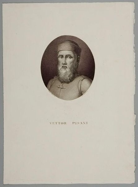 Curator: We are looking at an engraving by Pietro Anderloni, who was born in 1785. The print is titled "Leonardo da Vinci." Editor: He looks like a prophet, stern and knowing, set within this tight oval. Curator: Note the engraving technique here. Anderloni really emphasizes Da Vinci as a man of labor, a craftsman. Editor: Absolutely, and what of the symbols? The beard, the head covering. It's a presentation of wisdom, of age. It feels like we are meant to see him as more than just a painter. Curator: I think the materiality of this print is important. It democratizes the image of Leonardo, putting him within the reach of many through mass production. Editor: A fascinating intersection, indeed. A symbol of genius reproduced for the masses. Curator: It makes you consider how the image of an artist becomes its own commodity. Editor: A potent reminder of the power of enduring images.