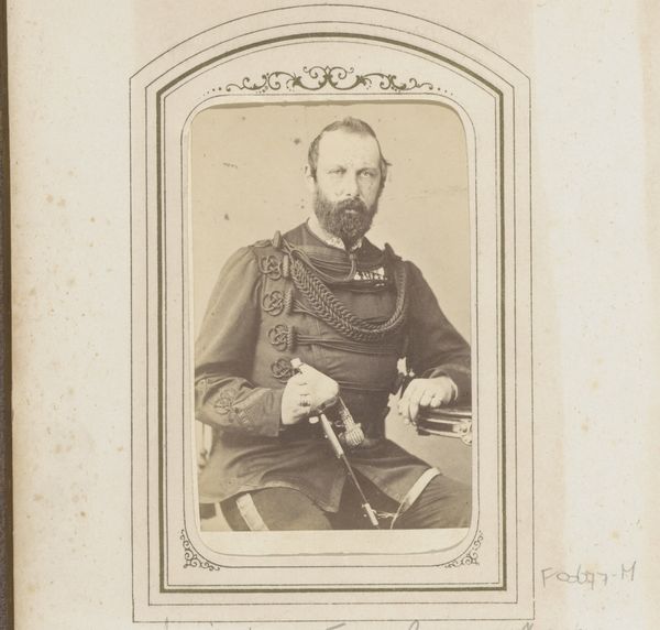 Curator: Let's turn our attention to this studio portrait of a man, captured between 1863 and 1866, and currently held here at the Rijksmuseum. The photographer, Hermann Günther, rendered this gentleman in a very typical style for the period: with his walking stick and elegant hat, this albumen print represents an important part of portraiture in the mid-19th Century. Editor: There’s something undeniably formal about the portrait. I immediately notice his guarded stance, his hand concealing most of the walking stick. Even his impeccably maintained facial hair speaks volumes, like a symbolic barrier or a personal emblem he’s carefully cultivated. Curator: Precisely! The albumen print, a photographic process popular then, gave photographs a distinct sepia tone. It was an interesting time, as photography transitioned from a novelty to a tool used widely for record-keeping but also for self-promotion by the emerging bourgeoisie. Editor: And that tone does a lot of work for the period, doesn’t it? I wonder, beyond documenting status, what it suggests psychologically. It has the symbolic weight of bygone eras when photography was inextricably bound to portraiture as an extension of ancestral heritage. Curator: Indeed. The sitter's formal attire--a suit with distinct fabric details--mirrors societal expectations and the importance placed on outward appearances. These garments signal a level of cultural knowledge about fashion in that epoch, which in turn becomes a visual signal in the present. The costume in many ways constitutes a persona of the day. Editor: That persona, or "role" of citizen and man, then gets reinforced by his choice of accessories. The hat is obviously meant to indicate social position and the stick offers not only physical assistance but visual dominance. How much, I wonder, were such portraits also performative displays of national pride during times of intense geopolitical shift? Curator: Definitely, we see the solidification of class identity that characterized the second half of the 19th century as states gained their borders. Well, what a journey into 19th-century aesthetics, politics, and the art of the photographic portrait. Editor: I completely agree; It’s these layers of historical and personal meaning that make such images continue to speak to us.