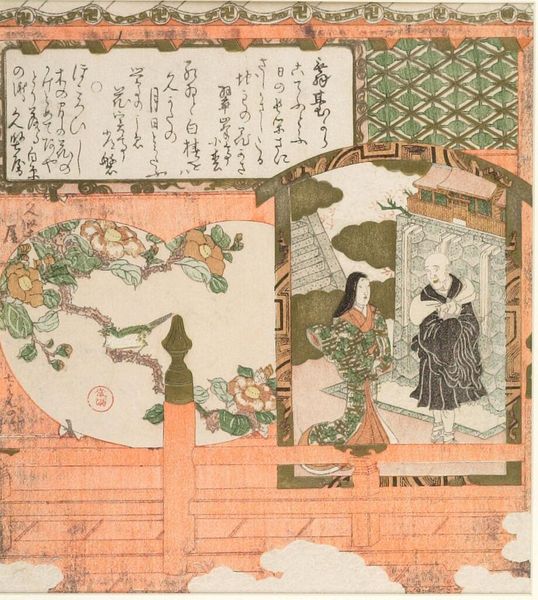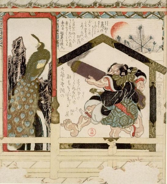 Editor: Here we have Yashima Gakutei's "Pictures of Otohime Riding Dragon and Pines at Sunset" from the series "Ten Designs for the Honcho Circle," printed on paper. The textures are amazing, especially the clouds. What do you notice about how this work was made? Curator: The woodblock printing process immediately grabs my attention. Consider the labor involved in carving those blocks, transferring the design, and the implications of mass production. It blurs the line between art and craft, doesn't it? Editor: Definitely! The way the sunset is rendered, layered behind the tree, seems complex, but also reproducible. It is both, right? Curator: Precisely. How does the artist’s choice of materials and techniques influence your understanding of its cultural context? It challenges our typical notions of value by embracing reproducibility. Editor: The print's accessibility changes how we think about high art. I hadn't considered how much the means of production affect how we appreciate it. Thanks. Curator: Indeed. Thinking about art in terms of its creation can open up a new way to appreciate art!