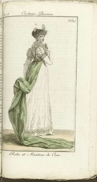 Curator: Looking at this, I'm immediately struck by its almost severe elegance, like a porcelain doll about to deliver a cutting remark. Editor: Indeed. What we have here is an engraving, crafted in 1805, entitled "Journal des Dames et des Modes, Costume Parisien, 1805, An 13 (622) Turban de Drap d'Or...", and it resides in the esteemed collection of the Rijksmuseum. The creator of this work is Horace Vernet. It presents itself as an exemplar of Neoclassical ideals applied to the burgeoning world of fashion illustration. Curator: Neoclassical, yes, with that determinedly blank face and the slightly intimidating height. There’s a stiffness to the fabric, even in print, that feels deliberately anti-comfort. And is that really gold cloth? It feels opulent but constrained. Editor: Observe how the artist employs precise linework to delineate the figure, emphasizing the clear contours of the dress and the intricate folds of the turban. Semiotically, the dress’s high waistline and simple silhouette consciously evoke ancient Greek attire. It's all about the symbolic resonance with a perceived Golden Age. Curator: Right. The message is restraint and taste, but it clashes with the ostentatious turban—that flash of gold fighting against the clean lines of everything else. Is it a playful contradiction or just…confused? It feels very French, in a subversive way. Editor: Consider the medium: engraving, which inherently demands a linear approach, reinforces the image’s emphasis on clarity and order. The application of this style to fashion illustration signals an interesting dialogue between art and everyday life during this period, don't you think? Fashion, suddenly imbued with the gravitas of "high art". Curator: Oh, definitely! The “everyday” elevated through an almost militaristic rigor. And despite being static, the figure almost sways. All that to capture…a dress. Though, now, after analyzing its components and underlying structure, it is the dress itself I’ll recall for a long time. Editor: Ultimately, Vernet presents not merely an image of fashionable attire, but also offers a complex commentary on contemporary aesthetic and cultural values, made accessible through print media, for popular consumption. Quite compelling.