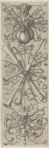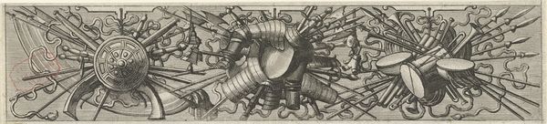 This print, made by Johannes or Lucas van Doetechum, shows an array of blacksmith’s tools, all meticulously rendered through the process of etching. The sharp lines of the etching perfectly capture the textures and weights of the various metal implements. Hammers, tongs, and chisels are arranged almost like a coat of arms, celebrating the labor and skill involved in metalworking. The bellows at the bottom hint at the intense heat and physical effort required to shape metal. What’s fascinating here is that this isn't just a depiction of tools; it’s a statement about the value of craft in a changing world. The precise and detailed rendering elevates these everyday objects, suggesting that the work of a blacksmith is not only practical but also worthy of artistic representation. It challenges us to consider the social and cultural significance of manual labor, reminding us of the skill and artistry embedded in even the most utilitarian objects.