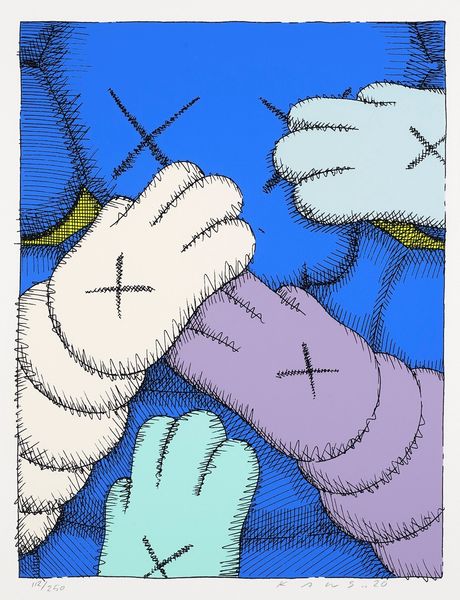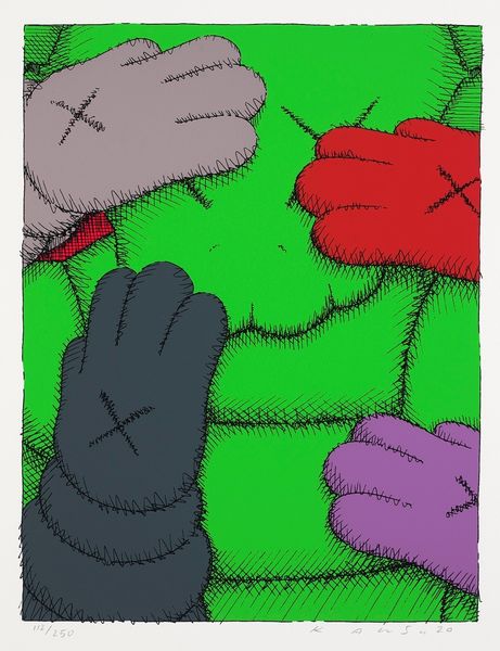 Kaws made "Urge #6" in 2020, and right away you can see how he's playing with color and mark-making. There's this great tension between the flat, graphic shapes and the scribbled, almost anxious lines. It's like the image is trying to hold still, but the hand of the artist keeps fidgeting. Look at the maroon shape behind the hands; notice how it’s not just one flat tone, but a field of tiny marks, all vibrating together? And the way the colors butt up against each other, no blending, just pure contrast. It's kind of confrontational, right? Like he’s daring you to reconcile these clashing elements. Then there are the hands, each with that signature X, a kind of stand-in for eyes, but also a cancellation, a negation. It reminds me a little bit of Elizabeth Murray, with her quirky forms and skewed perspectives, but Kaws brings this pop sensibility that’s all his own. For me, it's a great example of how art doesn't need to be polite. It can be awkward, messy, and still say something important.