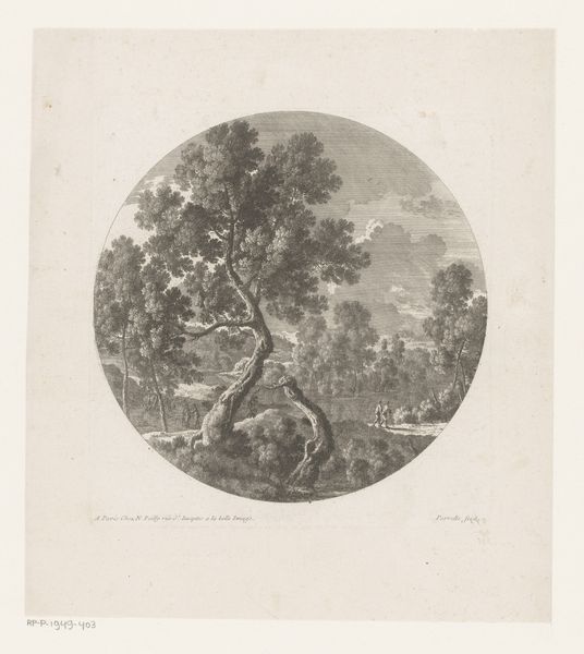 Curator: This print, dating back to sometime between 1650 and 1695, is titled "Landscape with walkers and figure on pack animal." It was created by Nicolas Perelle and is currently held at the Rijksmuseum. Editor: It’s remarkable how much detail Perelle packs into such a small, almost coin-like space. I find it melancholic. There's a muted stillness despite the presence of figures. What strikes you first? Curator: I'm drawn to the formal Baroque qualities—that classical balance, idealized naturalism. Yet, seeing this landscape isolated in a circular frame, it feels like peering through a portal, doesn’t it? Like a dream held captive. Editor: Indeed, a dream...and dreams are never neutral, are they? Looking closely, I'm wondering about the relationship of those walkers near the building to the lone rider in the center. Who gets to traverse this land freely and who remains on the periphery? This isn't simply an innocent walk in the woods; these images always negotiate power. Curator: That’s insightful. I see how that reading could unveil deeper tensions. The use of engraving does create a sort of rigid boundary between light and dark that emphasizes the inherent drama of human activity and the landscape around them. Editor: And that contrast – the deliberate darkness pushing against light – for me speaks to an unease. This could very well be a critique of the pastoral ideal so popular at the time. The artist hints that it may not be so peaceful, equal, or romantic at all. Curator: Yes, perhaps Perelle is engaging in some visual commentary, complicating the then conventional ideas of the countryside as a safe and nurturing space, echoing broader cultural shifts of the time. Editor: Thank you! I think there is nothing else for me to add at the moment! Curator: Likewise! Let's move to the next artwork, shall we?