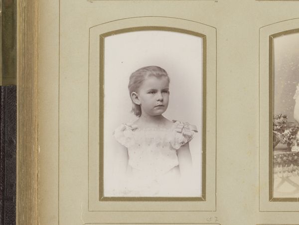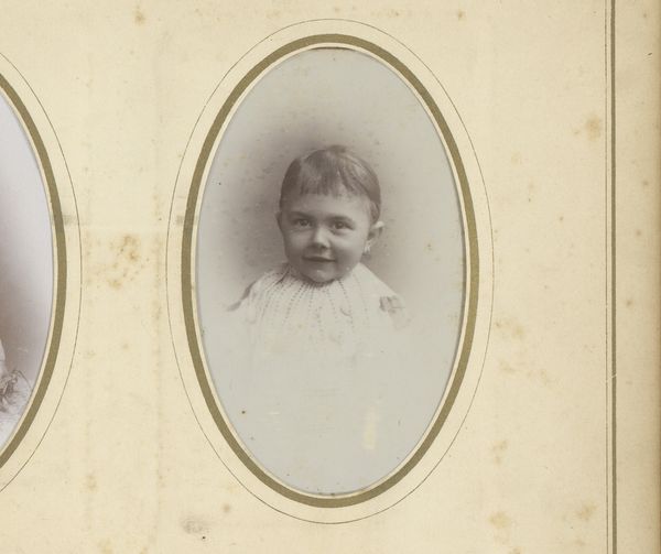 Curator: Ah, here's a captivating piece, possibly from the early 1900s, attributed to Theodorus Ferdinant van de Pol. It's an albumen print, titled "Portret van een kleuter in gehaakte jurk, zittend op een hek"—"Portrait of a toddler in a crocheted dress, sitting on a fence". Editor: My first impression is its wistful quality. The sepia tones and the child's direct gaze create a sense of longing. The oval frame constricts the image and adds to that melancholy. Curator: Indeed. The photograph captures a moment of carefully constructed innocence, part of the cultural memory surrounding childhood. The dress itself—hand-crocheted—speaks volumes about domesticity, care, and perhaps even the economic status of the family. Editor: It is interesting how the white dress pops because the chromatic scale moves around these white values, enhancing this specific cultural and psychological innocence. Curator: And what do you make of the child being placed on a fence? Is it a barrier or an opening, physically? The child stares towards the camera lens to suggest their individual psychological growth towards the viewer. Editor: Ambiguity, certainly. Is she being confined or presented? It speaks of thresholds, of a child poised on the cusp of something, both physically and metaphorically. Perhaps even childhood becoming adulthood. Curator: A potent symbol! One cannot help but wonder about her future as an audience to the new world coming from technological advancements, a time full of societal shifts and possibilities during her lifetime, framed as historical advancement and historical photography. Editor: I'm also drawn to the formal elements; The monochrome quality is a clear and compelling strategy here. Curator: Precisely, the monochrome effect is used with the crocheted texture to draw emphasis to it. Editor: Van de Pol makes deliberate compositional choices, focusing our gaze on the very texture, highlighting form and craft. Curator: Examining photography of this time yields compelling insight to not just visual conventions, but cultural values placed upon childhood—a symbol with layers, don't you think? Editor: Agreed. Through composition, this albumen print encapsulates this cultural moment into a single arresting frame.