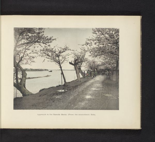 Editor: So, this photograph, titled *Gezicht op de oever van de Sumida rivier in Uenopark in Tokyo, Japan* was taken by Kazumasa Ogawa sometime before 1897. It’s a gorgeous scene. What first strikes me is the dreamy, almost ethereal quality, likely enhanced by the photographic techniques of the time. What catches your eye? Curator: The cherry blossoms dominate, of course. Think about the symbolism: transience, beauty, a poignant reminder of life's fleeting nature. The Japanese call it "mono no aware," the pathos of things. But look closer—how does Ogawa position figures walking along the Sumida River underneath this canopy? What statement does that pose? Editor: They are diminutive in comparison to the scale of the tree. Is this symbolic of man's role in relation to nature? Curator: Precisely. It's a deliberate contrast. This isn’t just a pretty picture. It’s a commentary on the delicate balance between humanity and the natural world, rendered with such a sensitive light, the image carries this poignant feeling which also tells you a story about history: As Japan opened to the West, how does Ogawa position traditional imagery against the backdrop of modernisation? What endures? What changes? The enduring allure of cherry blossoms against the modernising landscape suggests a fascinating dialogue. What do you feel looking at the characters? Editor: The figures seem almost lost in the grandeur of the scene. Maybe it hints at anxieties around societal change, a kind of cultural placelessness. Curator: Anxieties, hopes… yes, all intertwined. It invites us to reflect on our own place within larger forces, personal versus cultural identity. And isn’t that, after all, the power of enduring symbols? Editor: Definitely. I didn’t see so many layers on first look! Curator: Every symbol holds a mirror, inviting us to consider its reflections on our past, present, and future.