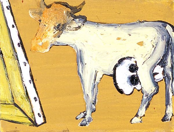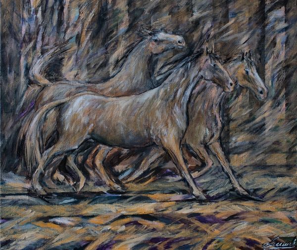 Niko Pirosmani created this evocative painting of a running deer using oil on oilcloth, a material more often found in utilitarian settings than fine art. Pirosmani wasn't formally trained; he was a self-taught artist who often worked on commission for taverns and shops in Tbilisi, Georgia. The oilcloth substrate, typically used for tablecloths or signage, speaks to Pirosmani’s direct engagement with the commercial world around him, and to the circumstances of his practice. The visible texture of the oilcloth, combined with Pirosmani’s expressive brushwork, gives the painting a raw, immediate quality. The simplified form of the deer, rendered in warm, earthy tones, stands out against the dark background. Its upward gaze and forward motion communicate a sense of freedom. This isn’t just a painting of a deer; it’s an artifact of a particular time and place, reflecting the artist's lived experience and his unique approach to making art, blurring the lines between the so-called 'fine' and 'applied' arts.