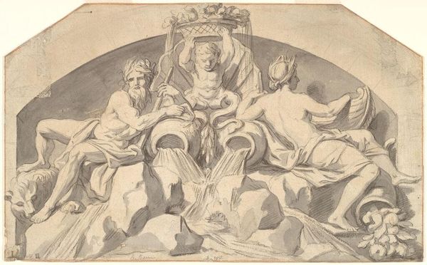 Editor: This is William Blake's "There Were Not Found Women Fair (The Book of Job)," housed at the Harvard Art Museums. I’m struck by the unfinished quality and the overall sense of melancholy. What do you see in this piece? Curator: Note how the central figure extends his arms, almost like a crucifix. This visual echoes not only sacrifice but also divine power, a prevalent symbol throughout art history used to convey emotional intensity and moral weight, doesn't it? Editor: It does! I guess I hadn't fully connected that imagery to the religious symbolism. Curator: Blake masterfully employs these symbols to explore themes of suffering and redemption, drawing from a shared cultural memory. The figures surrounding him are also symbolic, aren't they? Editor: This has given me a totally new way of interpreting Blake's work. Thank you!